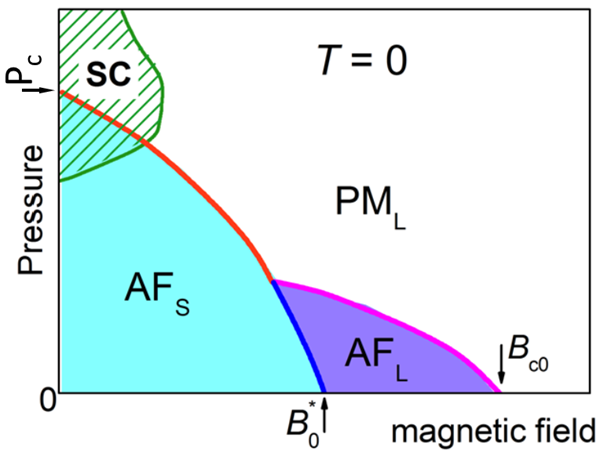 重费米子化合物CeRhIn5在绝对零度时的磁场-压力相图(示意图)。图中SC、AF和 PM分别代表超导态、反铁磁态和顺磁态;字母"S"和"L"分别代表“小”费米面和“大”费米面。AFS和AFL分别代表局域反铁磁态和自旋密度波(SDW)类型的反铁磁态。