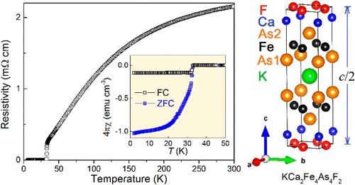 数年前,曹光旱及其合作者基于铁基超导体的晶体结构特征提出若干种新的结构类型,其中即包含这种具有双Fe2As2层的新型超导体[Chin. Phys. B 22, 087410 (2013)]。最近,他们成功合成出含有双Fe2As2层的五元化合物铁基超导体KCa2Fe4As4F2,其超导临界温度达到33K。该超导体由ZrCuSiAs结构的CaFeAsF和ThCr2Si2结构的KFe2As2交互生长而成(如图所示)。双Fe2As2层由碱金属离子K+所联结,因而每个Fe2As2层上下两侧的化学环境不同。与大多数铁基超导体另一不同之处是,由于“自掺杂”效应,KCa2Fe4As4F2无需通过化学掺杂即呈现出大块超导电性。研究还证实,它属于空穴掺杂型超导体。相关论文发表于《美国化学学会会刊》 (J. Am. Chem. Soc. 2016, 138, 7856−7859)。