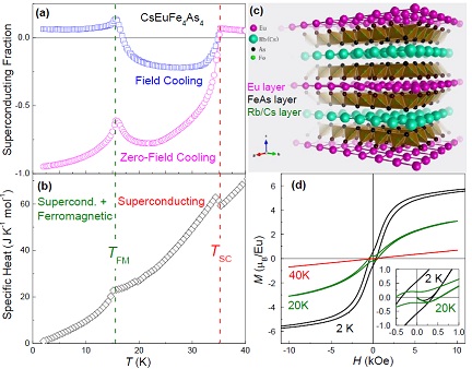 附图(a)和(b)显示CsEuFe4As4样品的直流磁化率和比热的温度依赖关系。可以在15.5K和35.2K看到两个明显的转变。一般地,低磁场下直流磁化率可测定样品的超导体积分数。图中可以看出,超导磁屏蔽分数(零场冷却数据)在最低温度下近乎达到100%。这表明确为大块超导电性(由下图明显的比热跳变进一步证实)。有意思的是,场冷磁化率在16K以下变为正值(不再具有抗磁性)。进一步的磁场依赖的磁化曲线[图(d)]表明铁磁序的形成。需要指出的是,低温下超导电性依然存在。这可以从初始磁化曲线为负值以及高场下的磁化曲线不重合现象做出判断。该研究组还注意到另一个有趣现象:即在铁磁转变时无比热跳变,仅看到一个转折(其导数不连续),提示它是个罕见的三级热力学相变。