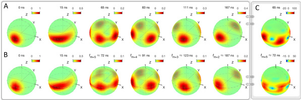 图:在实验控制条件下,20个人造原子集体从零时刻起跑后的相干演化动态过程的捕捉。不到200纳秒的过程中,人造原子的集体状态历经多次变身,在不同时间点出现有不同组份数(对应球中红色圈的数量)的薛定谔猫态,最终形成2组份(同时存在两种相反状态)的薛定谔猫态。A和B图分别为理论预测和实验观察结果。C图为根据建议在新视角下对5组份薛定谔猫态的重新描绘,球中蓝色区域的出现更有力地证明了量子纠缠的存在。