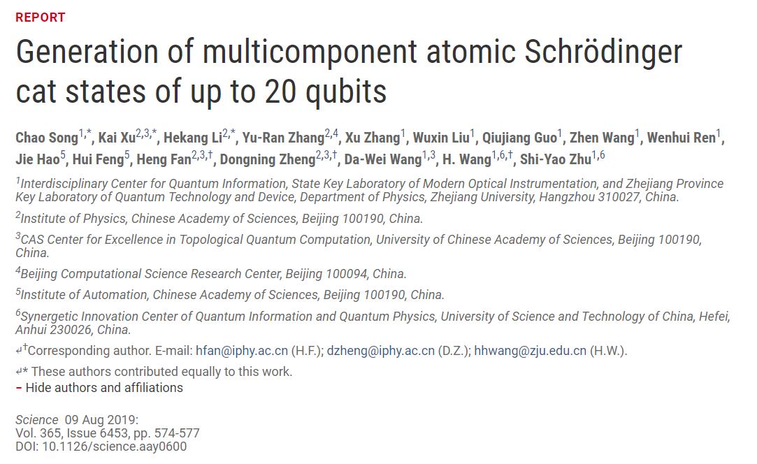 浙大物理系博士生宋超、中科院物理所许凯副研究员和博士生李贺康为论文共同第一作者。中科院物理所范桁研究员、郑东宁研究员和浙大王浩华教授为共同通讯。其他作者包括浙大王大伟教授、朱诗尧院士,中科院自动化所蒿杰研究员、冯卉助理研究员,北京计算科学研究中心张煜然博士,以及浙大物理系参与超导量子计算和量子模拟实验平台建设的青年团队(全部作者及单位信息参见论文)。