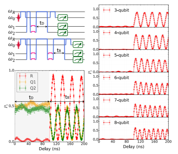 超导量子处理器有高度的可操控性,为研究超辐射和亚辐射间的快速切换技术提供了可能。研究团队通过中心耦合腔将单个光子共享于多个量子比特中,制备了多达10个量子比特的纠缠态(W态),该态向中心腔反向辐射光子的过程即是超辐射。研究团队实验制备了包含不同量子比特数的超辐射态,验证了辐射速率随量子比特