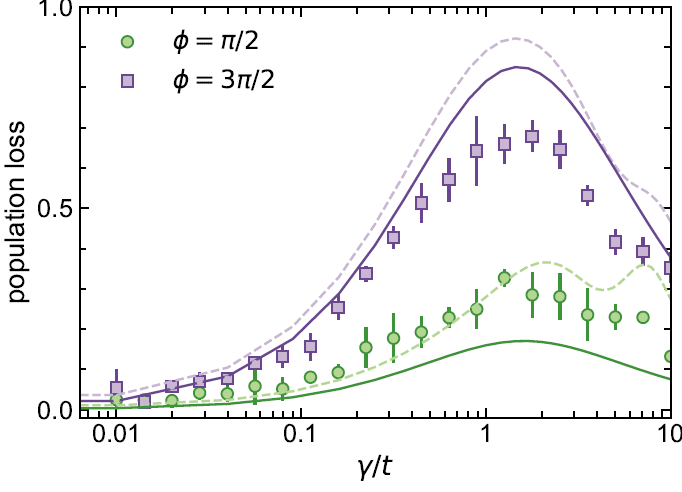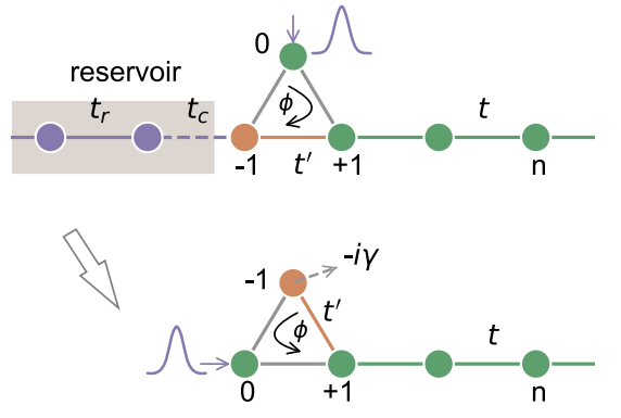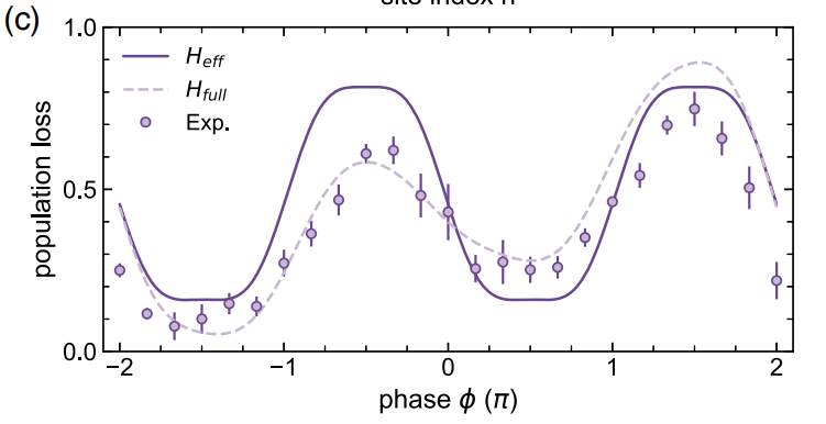 超冷原子系统具有环境干净,参数高度可控等优点,是进行量子模拟的理想平台。研究团队在玻色-爱因斯坦凝聚的基础上,通过对射的Raman Bragg激光来将处于绝对零度附近的原子耦合到不同的动量态上,实现了动量空间的一维类晶格结构。然后利用一个四光子过程将两个次近邻的格点耦合到一起,从而实现一个AB(Aharonov-Bohm)环结构。再利用另外一边的链作为热库,产生等效的损耗,从而产生一个等效的非厄米AB环结构。