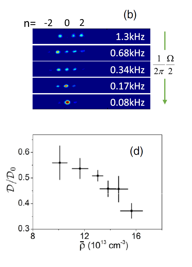 利用原子之间自身的碰撞相互作用,课题组还开展了多体相有关的研究工作。通过调节动量空间类晶格结构的相邻格点的耦合强度和原子间相互作用强度之比,观测到原子在量子行走的动态过程中的原子行为从局域化变到非局域化。