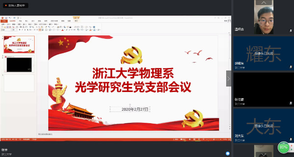 2月27日,光学研究生党支部响应物理系党委的号召,通过钉钉召开了一场线上会议,以理论学习,话题讨论等方式深入探讨党员的责任担当,鼓励大家有信心战胜疫情,共同迎接新学期的到来。