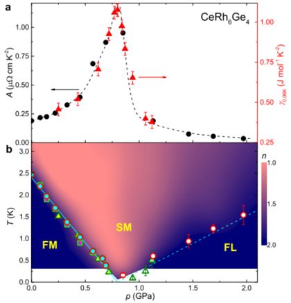 图3:CeRh6Ge4的压力-温度相图。在pc≈0.8GPa出现铁磁量子临界点,电子有效质量发散。