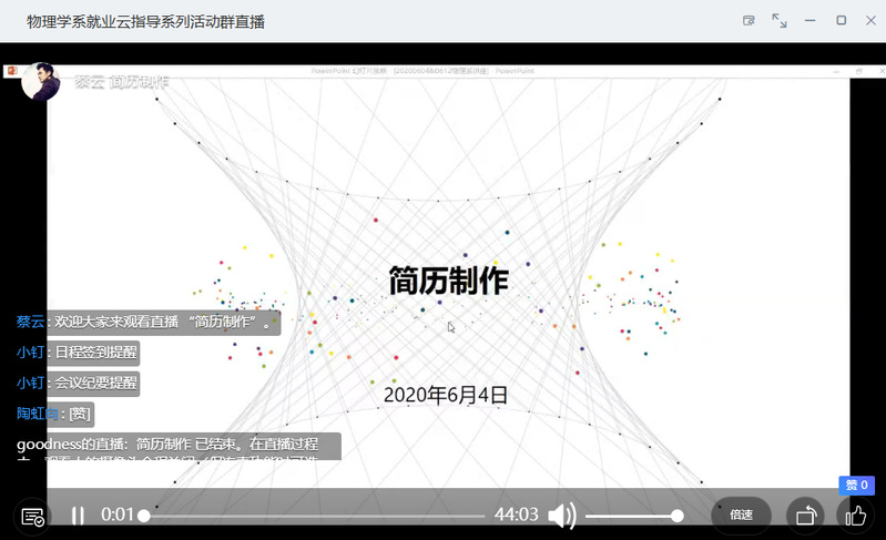 2020年6月4日星期四下午1点30分,由物理学系主办的就业指导系列之线上求职训练营——简历制作顺利举行。与会同学主要为2016和2017级本科生与研究生。本次交流会直播观看人数达464人,点赞数达1124人次。