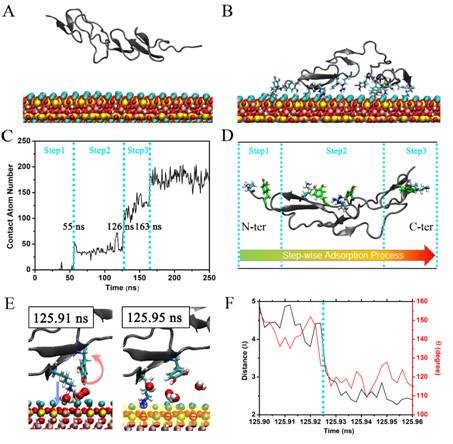 图2. 蛋白在云母上的吸附过程。(A-C)蛋白吸附的初始和最终构象,蛋白与云母的接触原子数(D)参与蛋白吸附的氨基酸对。(E-F)特定氨基酸对的结合过程。