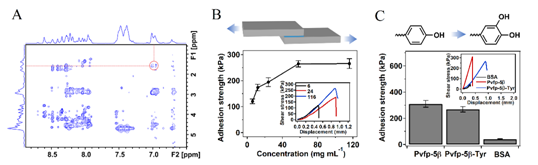 图4. 核磁共振谱和剪切拉伸测试。(A)未修饰肽链的2D 1H-1H NOESY 核磁共振谱。红色圆圈表示Tyr芳香环氢原子和赖氨酸的R-CH2-R的烷基氢原子的关联信号。(B)不同蛋白浓度未修饰蛋白的粘附强度。(C)蛋白BSA,未修饰蛋白和修饰蛋白的粘附强度。