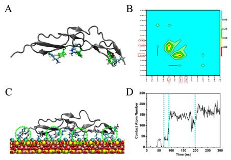 图3. 未修饰蛋白的构象和吸附。(A)蛋白构象。(B)不同类型氨基酸的相关性矩阵。(C-D)蛋白吸附在云母上的典型构象,氨基酸对用绿色虚线圆圈表示。蛋白与云母的接触原子数。