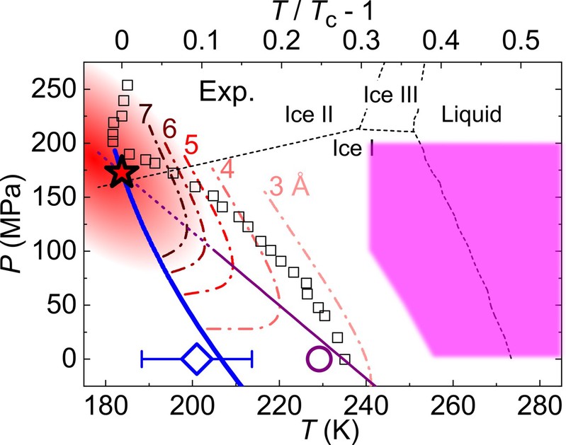 图一、水的相图,其中五角星为推测的液液相变临界点,红色区域为临界区,紫红色区域为实验上易于观察到水的反常行为的温度和压强范围。