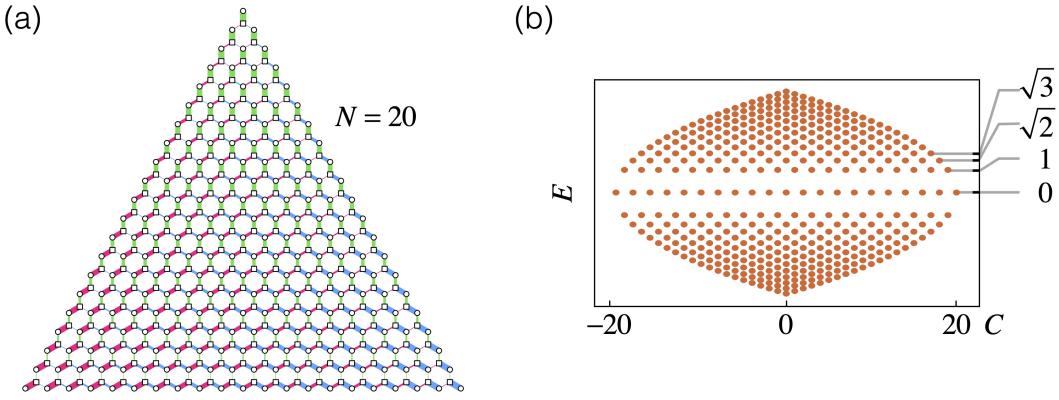 (a)包含20个光子的蜂窝状福克态晶格及其随位置变化的耦合系数。(b)三模JC模型正比于根下n的能谱。