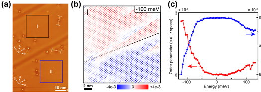 图:(a)FeSe表面的液氦温度STM图像。(b)I区域测量的[110]电子序在-100 meV能量处的局域分布图。(c)畴壁两侧的电子序随能量变化关系,形成了[-40, 40] meV范围的能隙。