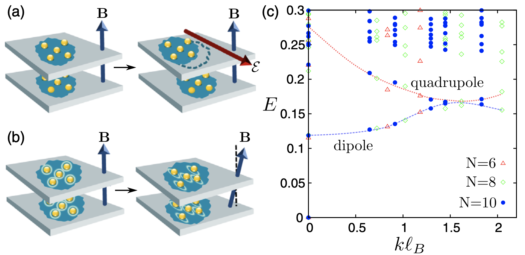 (a)在一层突然施加电场驱动量子淬火;(b)突然偏转磁场驱动量子淬火;(c)双层Halperin系统的低能激发谱,两支中性激发模清晰可见。