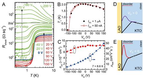 图2:在-200 V到150 V区间施加不同门电压时LaAlO3/KTaO3界面的(A)面电阻(Rsheet), (B)超导转变温度(Tc),(C)载流子浓度(n2D)和迁移率(μHall)随温度(T)的变化。(D, E) 不同门电压对界面载流子分布的影响。