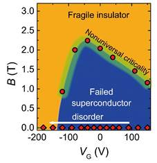 由于在该研究中场效应的实质是调控载流子所感受到的有效无序度,因此其中蕴含了丰富的二维超导与无序相互作用物理。研究团队在低温下观察到新奇的、可被连续调控的量子金属态(图2A:电阻平台)。通过同时改变门电压(无序度)和磁场,研究团队得到了这一界面体系丰富的量子相图(图3)。