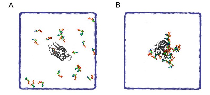图1. ATP在溶菌酶表面的结合和聚集。(A, B)ATP与蛋白质结合的初始和最终构象。
