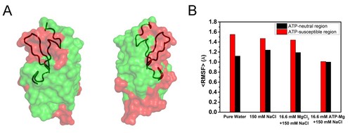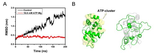 图3. 高温环境中溶菌酶的结构稳定性。(A)蛋白质的结构变化程度(B)ATP结合可以稳定蛋白质结构(左图)