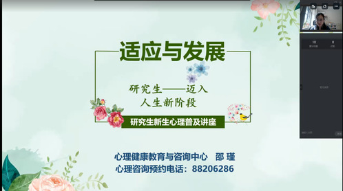 2021年9月19日下午,物理学系邀请学校心理健康教育与咨询中心专职心理咨询师邵瑾,通过钉钉群直播方式开展了“适应与发展——研究生买入人生新阶段”研究生心理健康知识讲座。