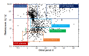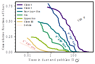 图二:上图为系外行星的质量随轨道周期分布图。下图为原行星盘中固体物质的质量随时间演化衰减的累计图。