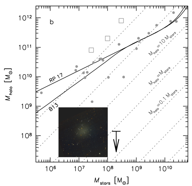图 1:Mstar-Mhalo 平面上的星系,其中 Mstar 和 Mhalo 分别是星系的恒星质量和暗物质晕的质量。星系形成和演化的理论模型预测 Mhalo 是 Mstar(黑线)的函数。典型的矮星系(灰色圆圈和空心方块)遵循这种关系。然而,与理论预期相比,黑色箭头所示的暗物质缺乏星系 DF2 的 Mhalo 太少了。图片取自van Dokkum et al. (2018)。