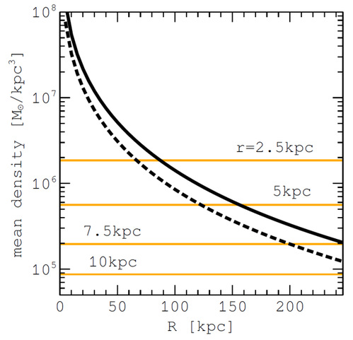 图 3:平均密度的比较。暗物质缺乏星系的平均密度是其所受潮汐力(橙色线)影响大小的指标。线上也标明了距暗物质缺乏星系中心的距离 r。NGC1052的平均密度是其潮汐力强弱的指标。根据解析模型的建议,它是作为距中心距离 R 的函数,并乘以 2.5(实心黑色)或 1.5(黑色虚线)。当NGC1052的平均密度超过球状星团所在位置的暗物质缺乏星系的密度时,球状星团将被剥离。让我们考虑一个位于 r= 5kpc的球状星团。当缺乏暗物质的星系距离 NGC1052 中心R=100kpc 时,它将被剥离,而如果缺乏暗物质的星系位于R = 200kpc,则球状星团会留在缺乏暗物质的星系内。
