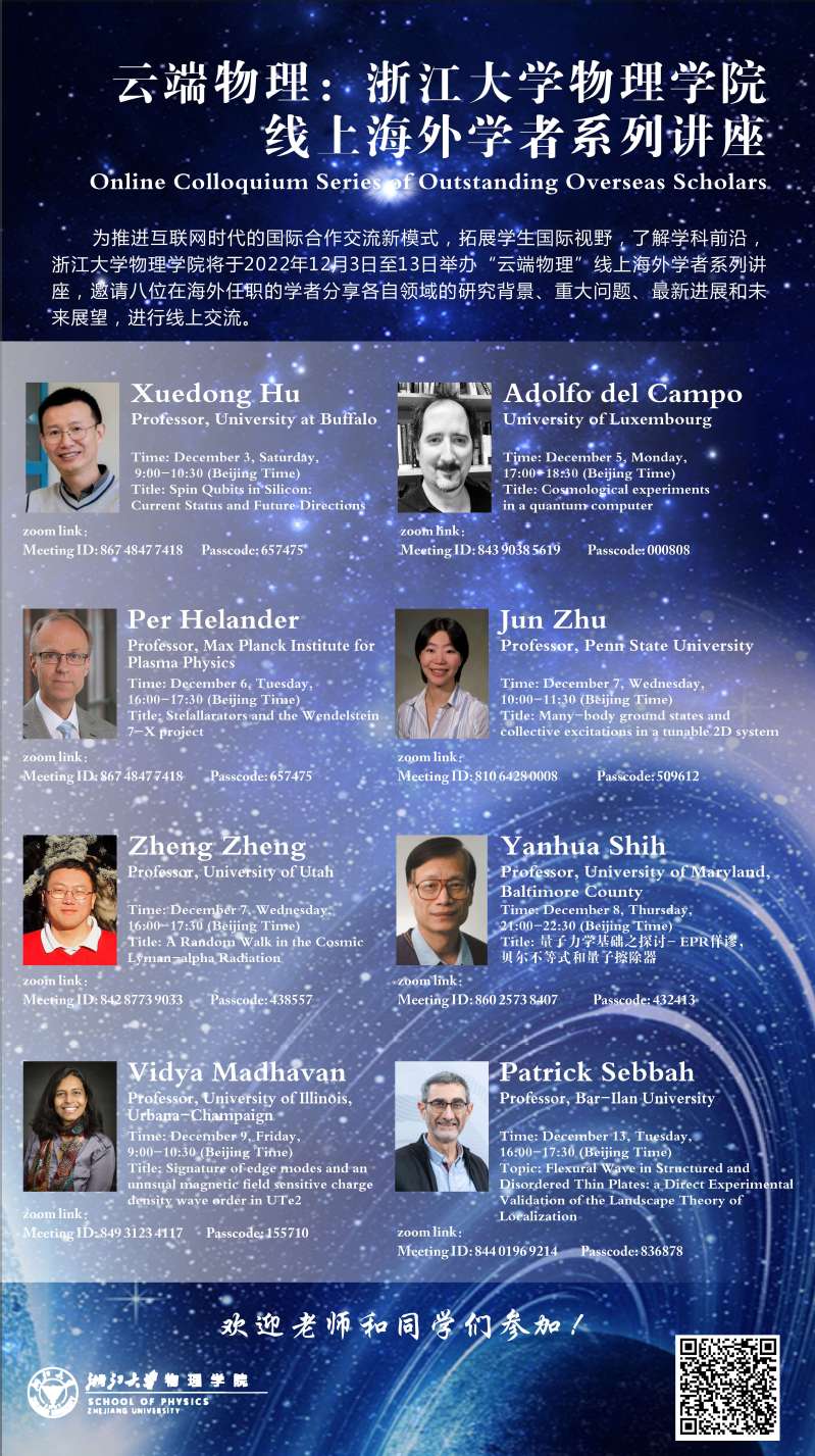 为推进互联网时代的国际合作交流新模式,拓展学生国际视野,了解学科前沿,pp电子游戏平台官网特别推出了“云端物理”线上海外学者系列讲座,邀请八位在海外任职的学者分享各自领域的研究背景、重大问题、最新进展和未来展望,进行线上交流。
