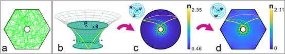 众所周知,广义相对论告诉人们:大质量天体的引力可以等效为其周围时空发生的弯曲,也即:空间与时间不再平直。直观地讲,即:当光线经过某一天体附近时,它的轨迹会发生偏折,不再沿着一般认为的直线行进。但由于引力效应一般比较微弱,这导致广义相对论在天文学上预言的现象很难直接在实验里被观测到,因此为了更方便地研究和验证广义相对论效应,研究人员利用类比思想在实验室环境中利用可控的二维弯曲曲面来模拟光在弯曲空间中的传输规律和光线轨迹的调控,同时为非欧几何光子器件的设计和制造提供重要研究价值。