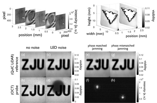 由于噪音既不能擦除也不能泄露路径信息,环境光噪音对QuIC LiDAR没有影响。我们用LED作为噪音源验证了这一结论。为了测试雷达的抗阻塞效果,我们将一束和探测光相同频率的激光射向晶体,结果只在少数像素点通过非线性过程产生了噪音,而其他像素不受影响。QuIC LiDAR可在强光照射下使用,具有毫秒级成像时间以及微米级距离探测精度。此外,该雷达既具有红外光的穿透能力,又可以利用硅基探测器进行灵敏探测,兼具1550和905纳米激光雷达的优点,结合光学芯片技术可用于开发高抗噪性的汽车光雷达。