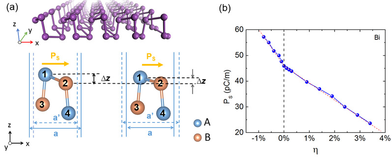 图1 (a) 二维铁电单质V主族单层(As, Sb, Bi)的晶体结构;(b) Bi单层的极化随施加x轴应变η的变化。