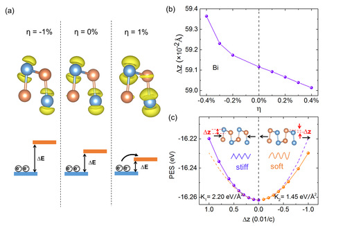 成果简介:近日,pp电子游戏平台官网陆赟豪教授团队基于第一性原理计算揭示了一类具有NLP的二维单质材料(As,Sb,Bi)。其结构与黑磷相似,主要区别在于其具有面外的原子屈曲畸变(∆z)破坏了结构的中心反演进而出现自发极化(图1a),这种结构已经通过扫描隧道显微镜技术证实。研究发现,这类体系具有巨大的负纵向压电系数,Bi单层的负纵向压电系数大小可以达到−1000 pC/m以上(图1b)。更重要的是,它的物理机制也不同于以前所有的例子,这与单质特有的面外畸变∆z有关。该畸变直接受到面内应变的影响,通常为正的internal-strain这里变为负值,甚至超过clamped-ion的贡献,导致出现显著的NLP。此外还报道了一个未知的现象:压电效应的非解析性,即压电系数在拉伸和压缩应变下表现为不同值。在二维Bi中,这种差异可达到18%。这种奇特效应也是∆z驱动的结果,它决定了势能面的非简谐性以及在拉伸和压缩应变下不同的结构刚度(图2)。基于这种新的机制,还发现了一些可能具有NLP的二维晶体结构。这些结果对功能材料的设计和器件的应用具有重要的意义。