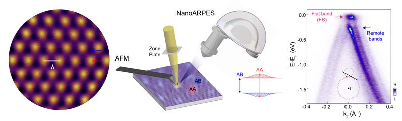 图1:双层转角石墨烯中的莫尔周期(AFM测量结果)及平带电子结构(NanoARPES测量结果)。[Nat. Mater. (2024) In press]
