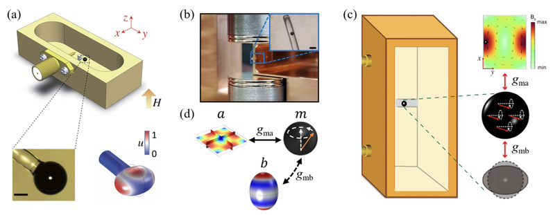 图1. 腔磁力学系统由微波腔、YIG小球支持的磁振子模式和形变振动声子模式构成。(a)-(c)分别为文献Sci. Adv. 2, e1501286 (2016),PRX 11, 031053 (2021),和PRL 129, 1123601 (2022) 中的实验装置图。(d)代表了系统中三个模式之间的相互作用。