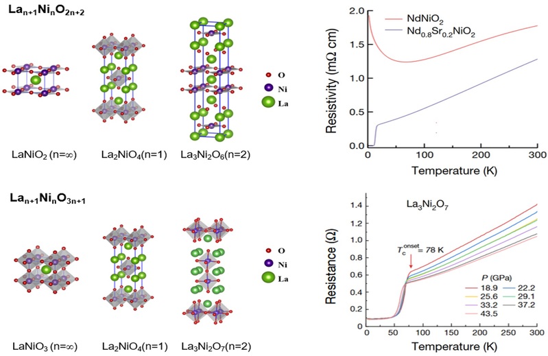 镍酸盐与铜氧化物高温超导体具有相似的晶体结构,因此也被认为是一类潜在的高温超导材料。然而,合成具有合适电子结构的高品质镍酸盐材料非常具有挑战性。早在1957年, LaNiO3和La2NiO4已成功合成,属于Ruddlesden-Popper (RP) 相系列化合物。RP相化合物由LnNiO3的钙钛矿层和LnO层交替组成,化学通式为Lnn+1NinO3n+1(图1左下),其中Ln代表稀土元素, n代表每个结构单元中NiO6八面体的层数。通过增加n值,镍的价态会从+2 (n = 1) 逐渐变化到+3 (n = ∞)。此外,通过软化学氢化方法去除NiO6八面体的顶点氧原子,可以得到还原的RP相,其化学通式为Lnn+1NinO2n+2(图1左上)。随着层数n的增加,Ni3dx2-y2