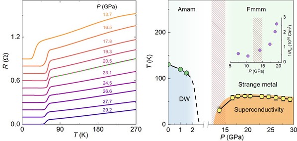 图3:不同压力下的电阻曲线(左图)以及压力-温度相图(右图)。