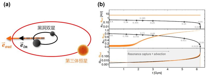 1 a)“黑洞双星+恒星”三体系统在发生共振锁定时的轨道位型示意图。(b)典型的黑洞双星与恒星轨道经历轨道共振的演化示例。