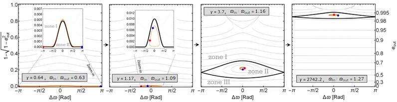 pp电子游戏平台官网的研究团队近日针对共面的黑洞双星+恒星三体系统进行了深入探究,特别分析了在并合双黑洞的微扰影响下,恒星轨道的长期动力学行为。研究发现,对于共面的三体系统,黑洞双星的轨道与恒星轨道的偏心率均会发生进动(近星点进动)。随着引力波辐射不断带走轨道能量,黑洞双星逐渐相互靠近,相对论效应随之增强,导致其轨道的近星点进动效应愈发显著,进动率显著提升。与此同时,由于双黑洞间距的缩小,它们对外部恒星轨道的微扰作用逐渐减弱,进而恒星轨道的近星点进动效应减弱,进动率降低。通过数值模拟,研究人员揭示了双黑洞并合过程中一个引人注目的现象:系统会经历一个由近星点进动引发的轨道共振,此时双黑洞轨道的偏心率矢量进动率与恒星轨道的近星点进动率达到一致。更重要的是,一旦系统发生了这种轨道共振,它将被锁定在这一状态,直至双黑洞最终合并。在这一过程中,黑洞双星与恒星轨道的近星点进动率将保持同步,偏心率矢量方向将呈现“对齐”,角动量的充分交换使得恒星轨道的椭率持续增长,其偏心率甚至能超过0.9