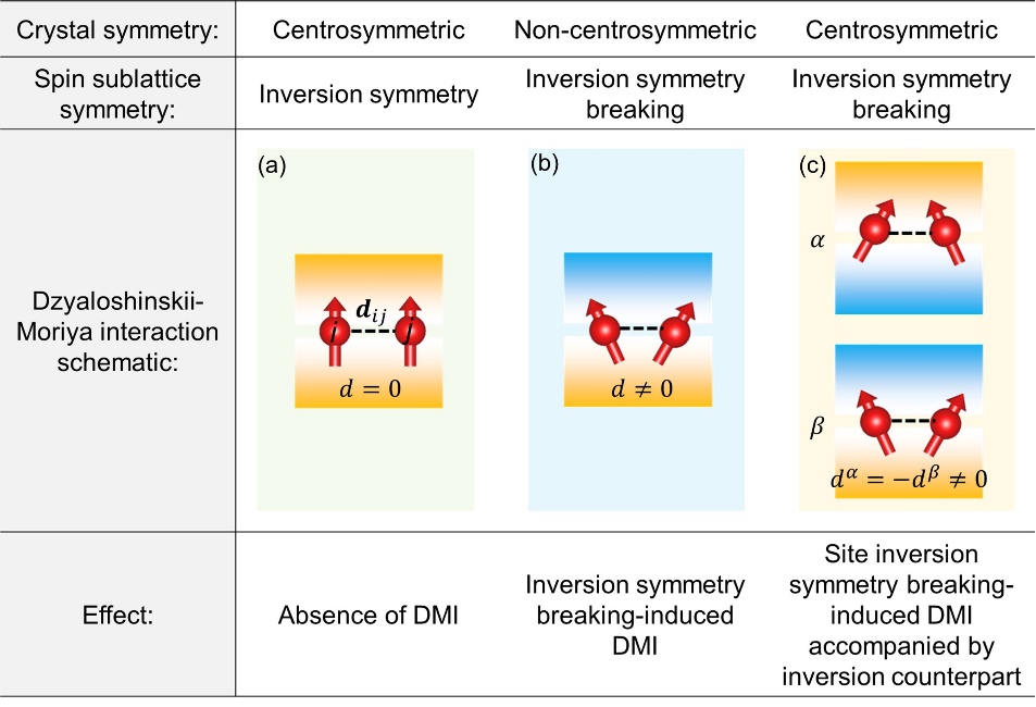 反对称交换耦合(Dzyaloshinskii–Moriya interaction, DMI)是自旋轨道耦合对磁相互作用在空间反演对称破缺下的内禀效应,是理解诸多与自旋轨道耦合相关物理学现象及开发自旋电子学应用的关键。不同于共线性的海森堡相互作用,DMI倾向于使邻近的自旋垂直排列,产生呈现出拓扑性相关的非共线性磁,在磁学和自旋电子学、拓扑物理、铁电、界面和电子气等体系都扮演着非常重要的角色,是连接自旋轨道耦合和诸多物理现象的桥梁。因而,DMI是构建相关新奇物态的微观机理与开发新型电子和自旋电子学应用的重要抓手,成为了最近20年来凝聚态物理研究领域的一个热点领域[Nat. Rev. Phys. 5, 43 (2023)]。特别的,DMI可以用于产生拓扑保护的实空间非共线磁涡旋准粒子,由于具有纳米尺寸、结构稳定、易调控、驱动阈值电流小等优点,这些拓扑粒子有望成为下一代高速度、高容量、低功耗、非易失信息存储及逻辑运算的信息载体。DMI还可以用于实现高效自旋轨道扭矩[PRL 130, 056701 (2023)]、拓扑磁振子和磁电耦合等物理效应。然而一般认为DMI仅在具有中心反演对称破缺的磁性体系中才会出现,从而限制了DMI以及其相关的物理效应的研究与应用范围。