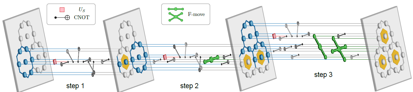 这意味着工作的挑战在于:模拟并不是直接构造出粒子,而是首先要模拟衍生出Fibonacci任意子的“弦”。“弦网液体”的基本单元是一个六边形的蜂窝状结构,而用于模拟的量子比特芯片是四方形的点阵结构。为此,清华大学邓东灵研究组提出实验方案,通过巧妙的倾斜设计,让多个量子比特的活动整体呈现出六边形网格特征,并用一个量子比特来对应“蜂窝”边上的一条“弦”,见图2。通过操控量子比特的状态,可以将“弦”连成特殊的“网”,从而制备出可以容纳Fibonacci任意子的“弦网液体”,图3展示了制备系统基态的量子门线路。
