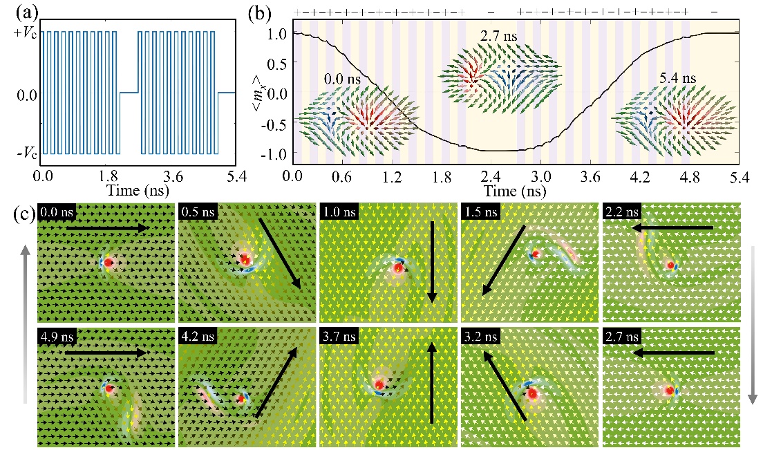 图2. (a)用于产生Bimeron力矩的交变脉冲电压;(b)Bimeron力矩驱动的平均面内磁化 <mx> 的正向切换(0-2.7 ns)和反向切换(2.7-5.4 ns);(c)对应于(b)中面内磁化切换的Bimeron动力学。长实箭头表示铁磁背景方向。