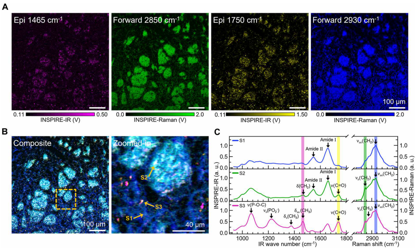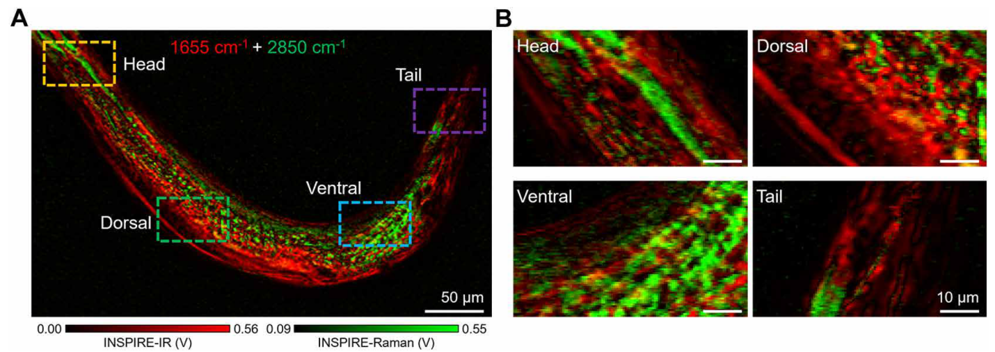 INSPIRE还在患病小鼠脑的纹状体区域捕捉到了特殊的脂质结构,并捕捉到了与胆固醇分子相关的“指纹”。张永庆说“这些发现可能有助于我们更好地理解阿尔茨海默病的发病机制,为这种神经退行性疾病的早期诊断和治疗提供新思路。”此外,课题组还尝试将INSPIRE用于生命体成像,并在线虫中获得了双模态匹配的亚细胞分辨率的脂质分布图像。张永庆认为,这项“强强联合优势互补”的成像技术,有望在生物医学诊断、材料表征和药物研发等方面帮助人们获得更多关于生命的信息。