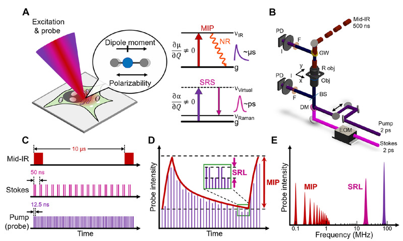 两种技术看似截然不同,研究团队还是琢磨出了它们的共同点:“从本质上来说,两者反映的都是分子振动,而且都使用了泵浦—探测的信号采集方式。”论文共同第一作者、博士生傅鹏程认为,这就是实现同时看到“硬币”两面的突破口。研究团队提出的INSPIRE技术方案,尝试用同一束探测光去捕捉两种泵浦光的扰动。“在同一束探测光中,我们编码了两种时间尺度的光学过程,一个是微秒级的中红外光热弛豫过程,一个是皮秒级的受激拉曼散射过程。”