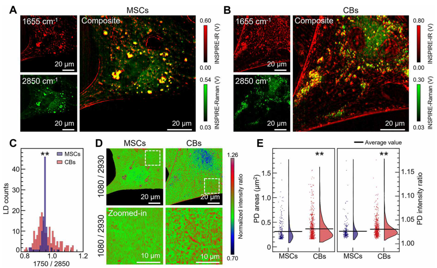 研究团队展示了成软骨细胞的成像图。“我们同时获取了细胞中脂滴和蛋白聚糖分子的图像,并可以清晰的看到它们的空间分布和比例关系。”傅鹏程说,“干细胞向成软骨细胞的早期分化过程中不同组分有着显著的改变。” 这些发现有望为理解干细胞的分化机制提供新的视角,推进再生医学的发展。此外,他们还在模拟了不同的药物分子进入细胞的场景,INSPIRE也成功“拍摄”了不同组分在细胞内“同框”的场景。