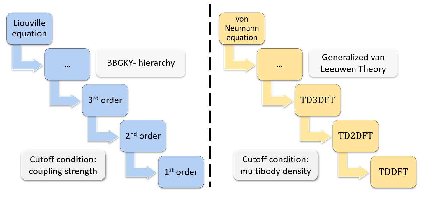 图2:基于广义van Leeuwen定理,与BBGKY链式方程相对应可以写出一系列多体密度泛函方程,区别在于BBGKY链式方程的传统截断条件是耦合强度,而后者的截断条件是多体密度演化行为。