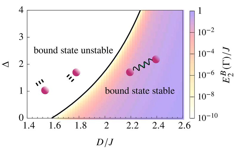 Figure 1: 三角晶格自旋S=1模型中双磁振子束缚态的稳定区间。横轴与纵轴分别是单轴与交换各向异性的强度。