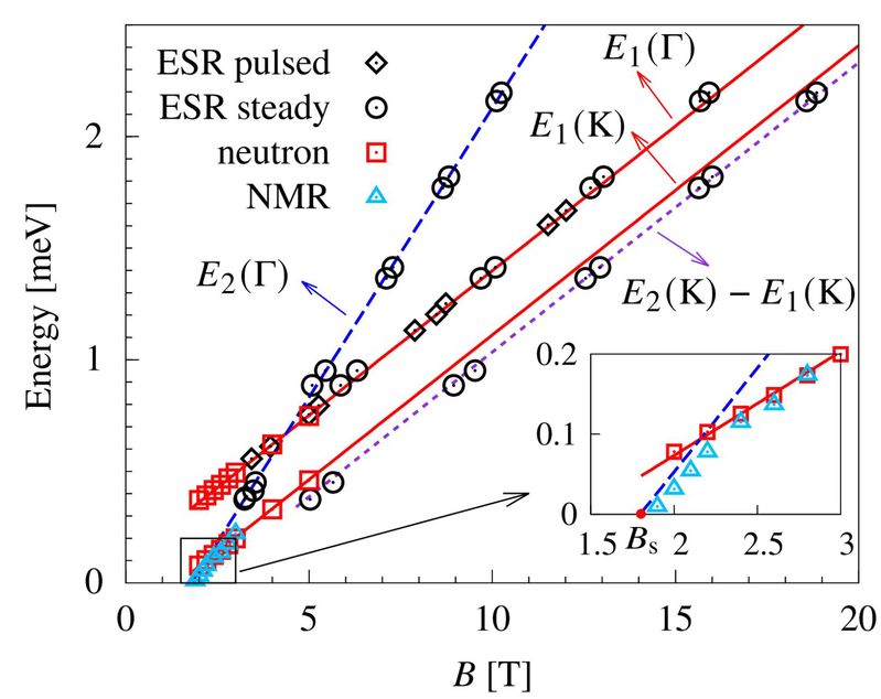 此外,该研究得到了多家国际顶尖科研机构的大力支持。其中,中子散射实验得益于澳大利亚核子科学与技术组织(ANSTO)于德洪教授、Richard Mole博士,美国橡树岭国家实验室散裂中子源(SNS)Andrey Podlesnyak博士、叶峰博士提供的支持。华中科技大学脉冲强磁场中心的欧阳钟文教授,以及合肥稳态强磁场中心的童伟研究员、马龙副研究员、张志涛副研究员为低温强磁场下的电子自旋共振实验提供了重要数据;中国人民大学于伟强教授开展的极低温核磁共振实验进一步验证了研究结果的可靠性。