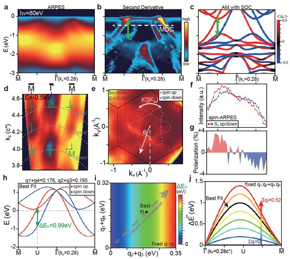 图2. (a) CrSb费米面附近的ARPES能谱,对应自旋劈裂的最大的动量点;(b) 与(a)图对应的二次微分谱图,绿色箭头标记能带劈裂;(c) 与(a)图对应的密度泛函能带计算;(d)能带沿Γ-M动量方向的劈裂沿c轴的分布;(e) ab面内的三重对称能带;(f,g) 费米能量附近自旋极化的动量分布曲线(f)和对应的自旋极化值(g),动量对应 (b)图的虚线;(h) 紧束缚模型计算的费米面附近自旋劈裂能带;(i) 动量点U处自旋劈裂大小与Cr次次近邻跃迁参数的依赖关系;(j)沿Γ-M动量方向的劈裂大小与Cr次次近邻跃迁参数的依赖关系。