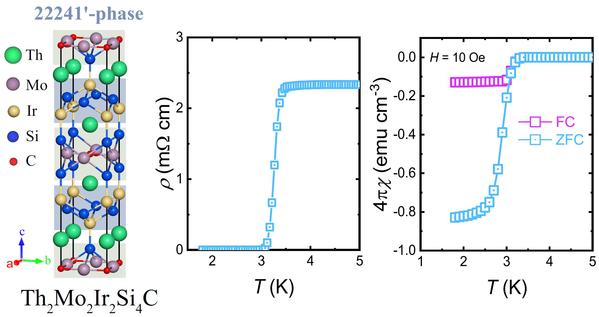 图1. Th2Mo2Ir2Si4C的晶体结构(左)及超导转变(中、右)