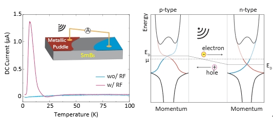 SmB6作为强关联电子材料的代表,凭借其易调控的小能隙(仅 3 ~ 5 meV)和易探测的拓扑表面态,成为研究关联拓扑绝缘体的理想实验平台。在 5 - 15 K 的低温下,其表面态会经历拓扑相变并逐渐形成完整的拓扑表面态。在这段中间温度,拓扑表面态的空间不均匀性打破了镜面对称性。在足够强的微扰作用下,团队发现该材料表面可以自然形成p型与n型表面电子态,这如同在材料表面“绘制”出无数微小的二极管。也正是在这一过渡温区,该研究团队发现SmB6在射频(RF)调制下表现出明显的整流效应与光伏效应:在功率低至 -20 dBm,频率在6.5 MHz左右的RF信号辐射下,可以在距离小于1mm的两个电极产生大于1微安的直流电流输出。该自生pn结的工作频率和输入功率明显低于许多其它薄膜拓扑材料。随后,佛罗里达州立大学的王啸宇博士还对由于空间上不均匀的拓扑表面态所形成的整流电流做了数值计算,取得了和实验一致的结果。