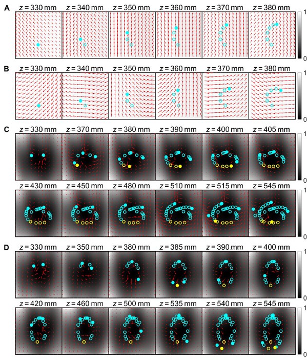 图2:不同传输距离下,测试涡旋在背景速度场中的运动图,图中青色和黄色圆点分别表示正涡旋和负涡旋的位置,空心点代表其上一帧所在的位置,实心点代表当前的位置;红色箭头表示背景速度场。(A)m₁ = m₂ = 1,(B)m₁ = -m₂ = 1,(C)m₁ = m₂ = 2,(D)m₁ = -m₂ = 2。
